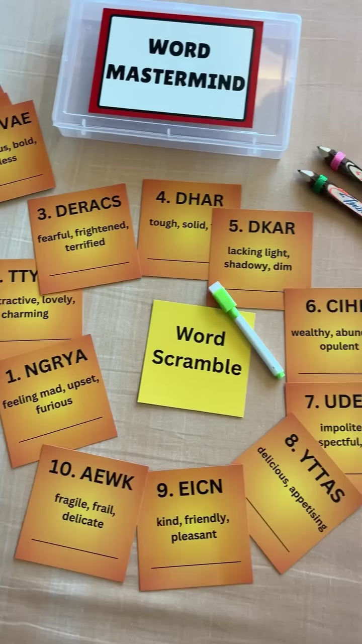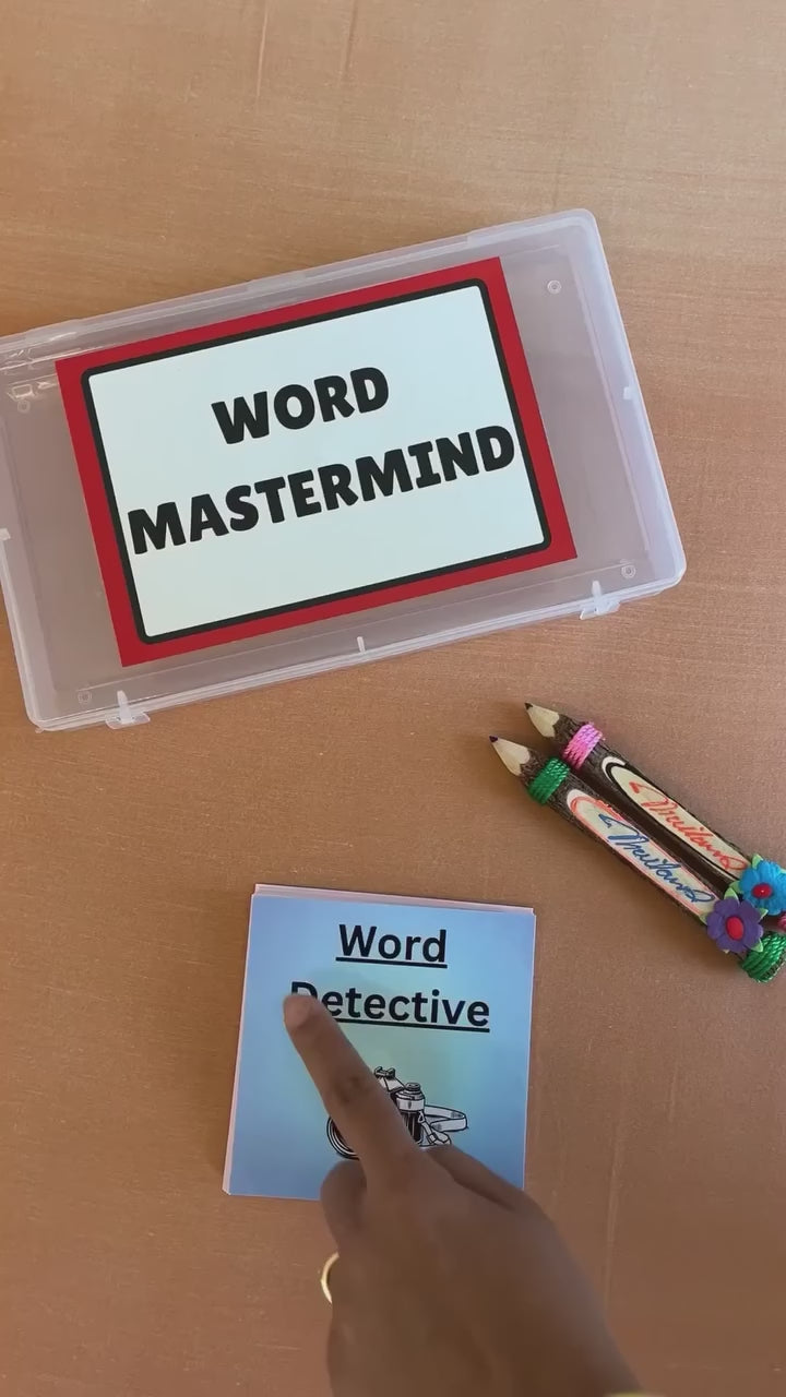 The Word Mastermind Game Kit includes Word Detective, Find the Synonym, Word Scramble, and Fill Up the Word. It helps children build vocabulary, strengthen spelling, and improve word reasoning through fun, hands-on challenges for school and everyday use.